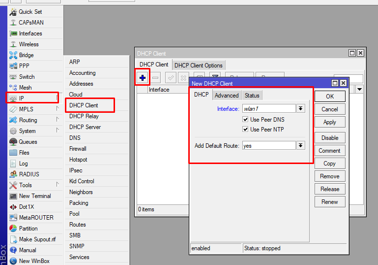 10. Setelah itu kita menambahkan DHCP client dengan cara klik IP>DHCP CLIENT>klik ADD(+)>PILIH INTERFACE WLAN1>APPLY>OK